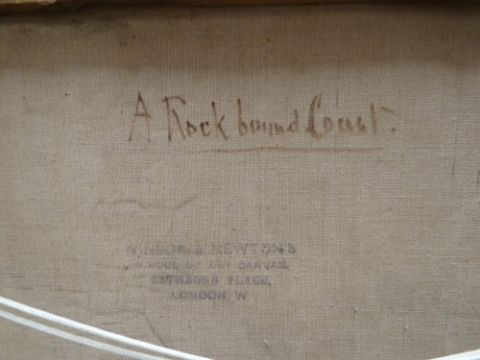 FRANK HIDER (1861-1933) oil on canvas - dramatic coastal scene with crashing waves against rocks with gulls and distant boats, entitled verso ' A Rock Bound Coast', signed, 28 x 49cms