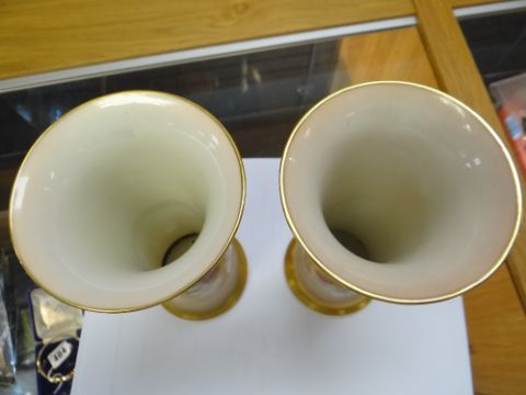 PAIR OF ROYAL WORCESTER PORCELAIN VASES having flared necks and flared bases, decorated with blackberries on the vine by Kitty Blake, signed, 19cms high