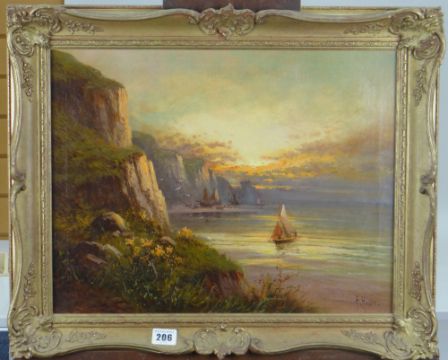 FRANK HIDER (1861-1933) oil on canvas - coastal scene at sunset with sailing boats, entitled verso 'Near Dowlish, S Devon', signed, 34 x 44cms