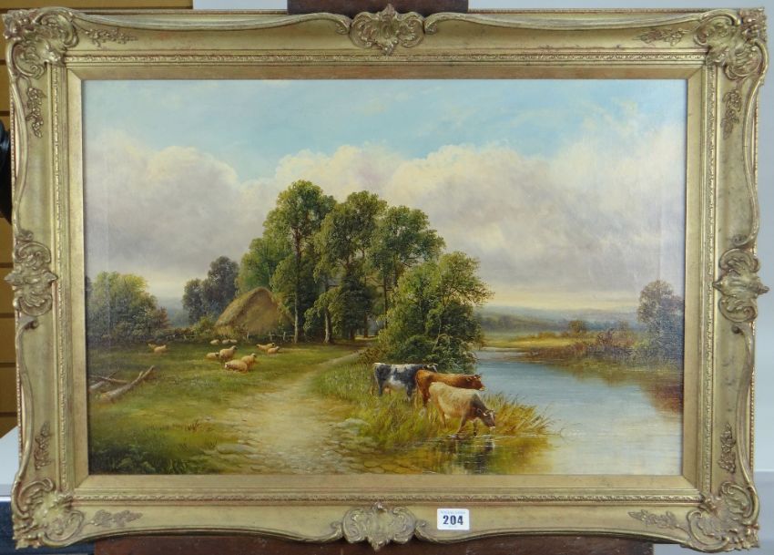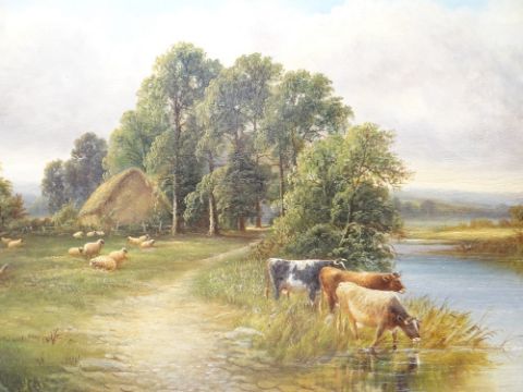 HENRY HARRIS OF BRISTOL (1852-1926) - oil on canvas, landscape with cattle watering, sheep and thatched barn amongst trees, signed, 39 x 58cms