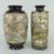 TWO SIMILAR SATSUMA POTTERY VASES, one of cylindrical form with bottle neck decorated with opposing panels of flora and fauna in a landscape and with gilt decoration to a blue ground reserve, 19cms high, the other of baluster form, with similar panels and having an unusual raised and gilded floral decoration to a blue ground, 18cms high, both with seal marks to the base