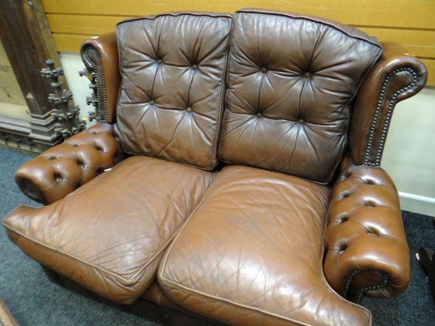 SMALL BROWN LEATHER TWO SEATER CLUB-STYLE WING BACK SOFA