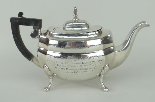 WALKER & HALL EPNS TEA POT with engraving relating to Cardiff shipping history, inscribed 'Presented to Mr & Mrs TJG Smith on the occasion of their silver wedding by the Directors and staff of Messers Morgan & Cadogan Limited Dember 13th 1919'