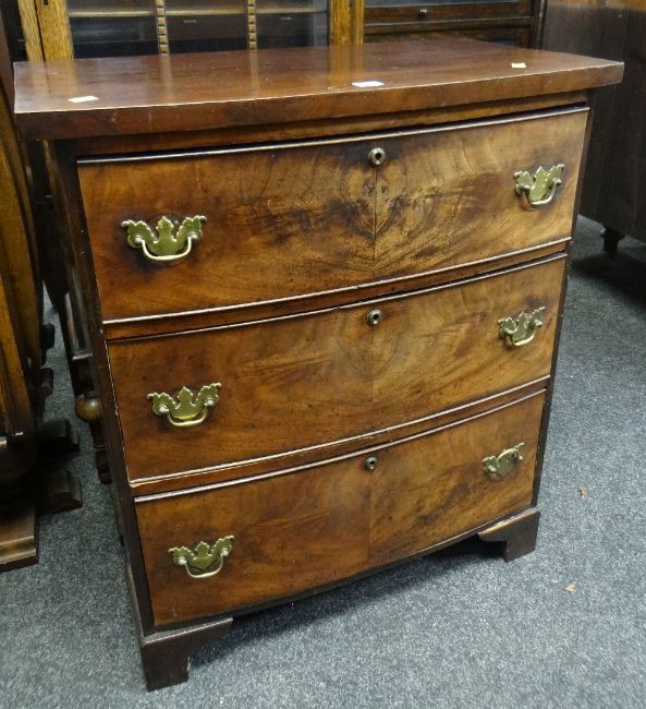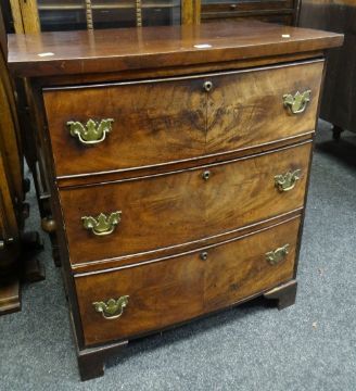 ANTIQUE MAHOGANY BOW FRONTED THREE DRAWER CHEST OF DRAWERS with brass fittings