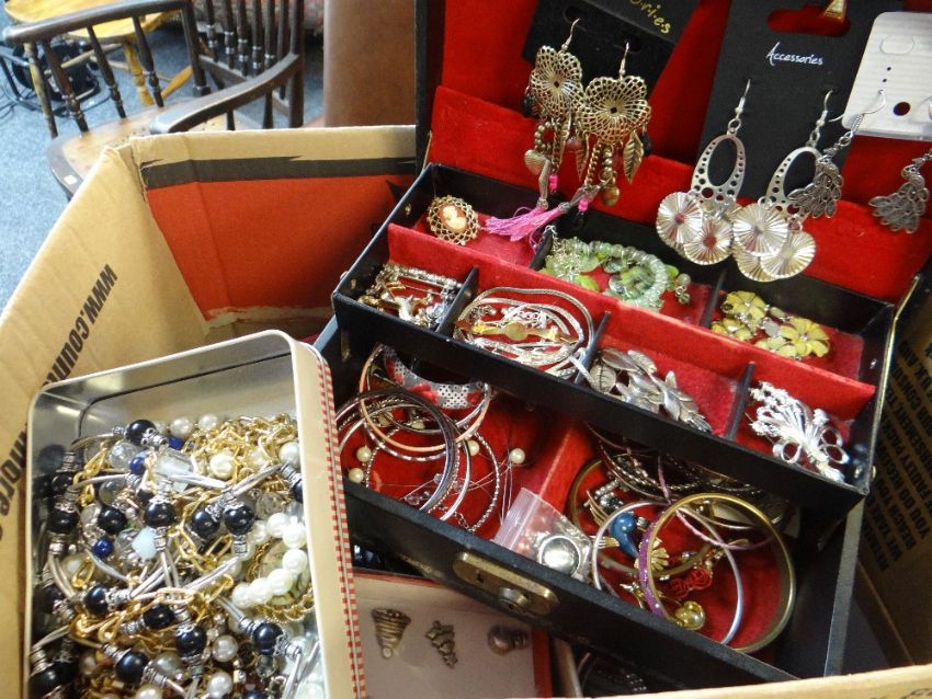 COSTUME JEWELLERY including items in a concertina jewellery box and other boxed and loose items (in Doritos box)