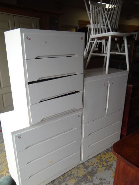PARCEL OF VINTAGE WHITE & BLACK ASH TOP STAG FURNITURE comprising painted white bedroom furniture, white painted spindle back chairs ETC