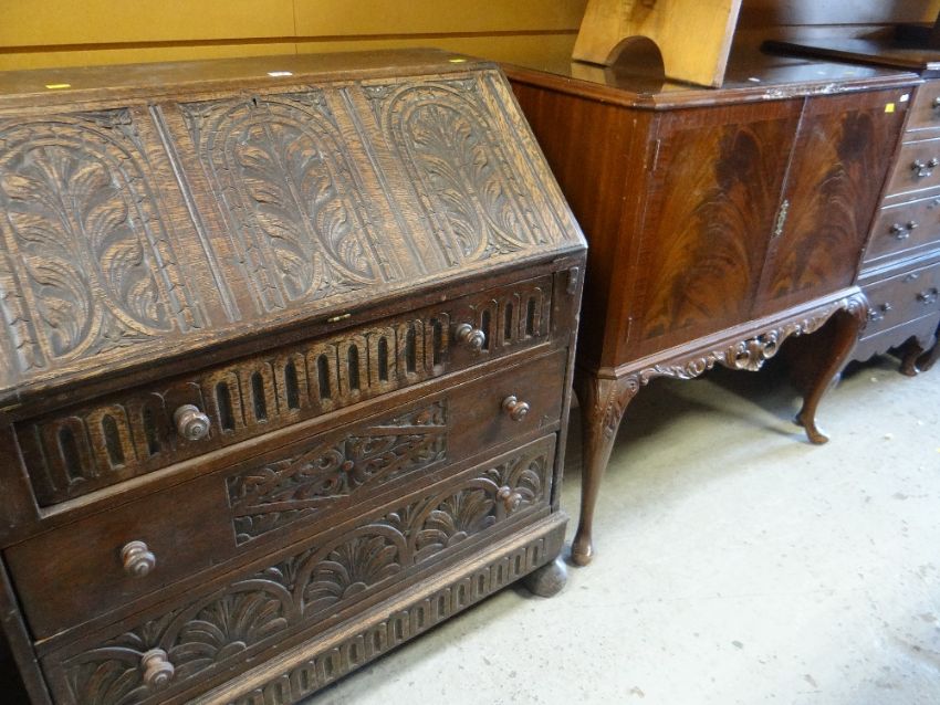 CARVED DARK OAK DROP DOWN BUREAU together with reproduction mahogany effect drinks / cocktail cabinet on raised cabriole legs