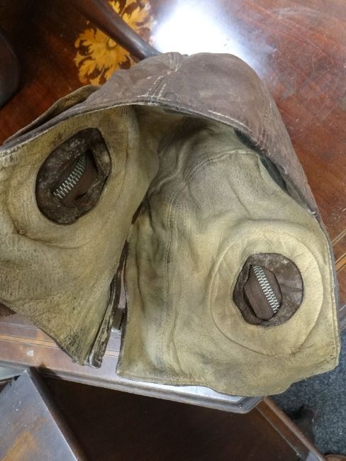 A VINTAGE BRASS COMPANION SET, postal scales, portal brass style clock and a vintage brown leather flying helmetno labels on the flying helmet