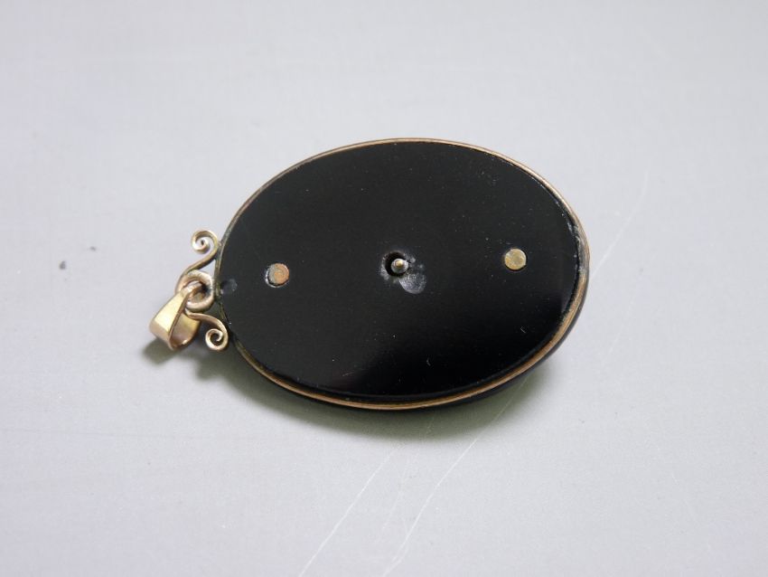 AN OVAL MOURNING PENDANT with centre pearl star cluster and gold hook and eye