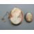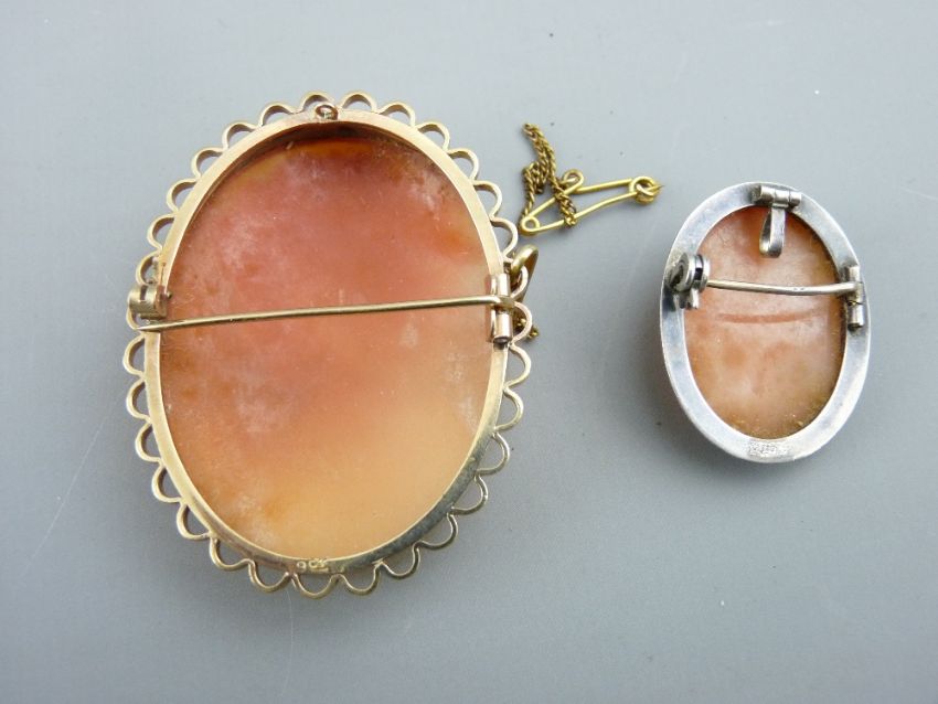 A LARGE OVAL 9CT GOLD CAMEO BROOCH with safety pin and head and shoulders depiction of a young lady, 4.5 x 3.5cms and a small silver backed floral cameo brooch, 2.7 x 2cms