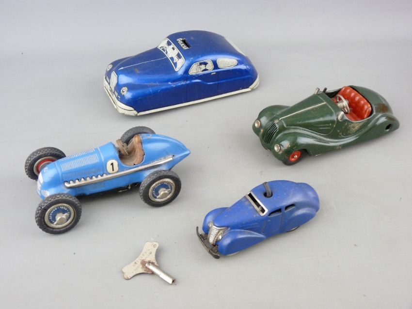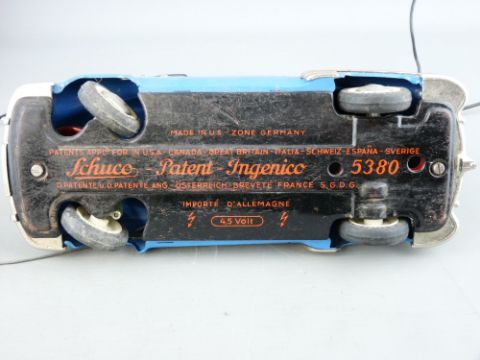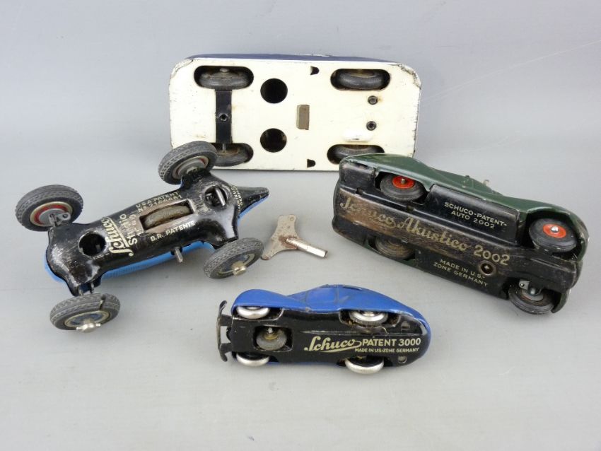 SCHUCCO AND OTHER CARS a collection, including a boxed Elektro Jngenico 5380 (one edge missing from box) and Akustico 2002, a Patent 3000, a Schucco Studio 1050 Mercedes racing car circa 1930s along with a friction driven police car - registration MT3320 (condition issues and losses)