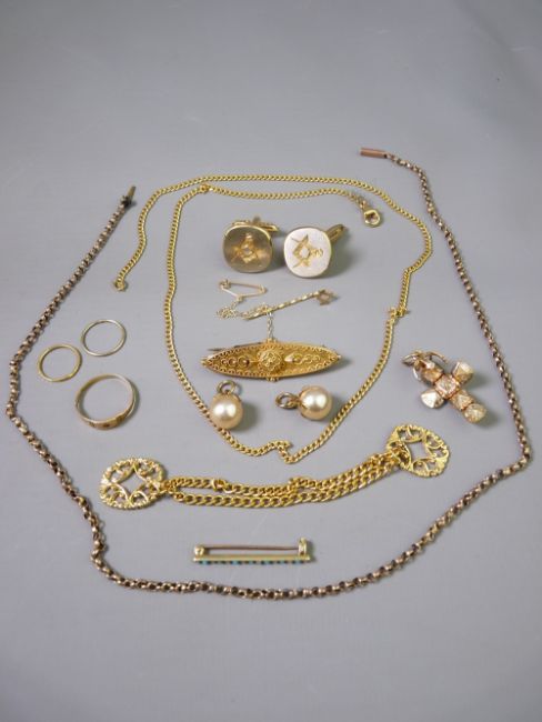 A 15CT GOLD BAR BROOCH 3.5gms, a narrow 9ct gold pin brooch with pearl and aquamarine decoration 1.5gms, a 9ct gold Masonic pin 0.4gms together with sundry yellow metal chains, pair of pearl pendants and a pair of cased yellow metal Masonic cufflinks