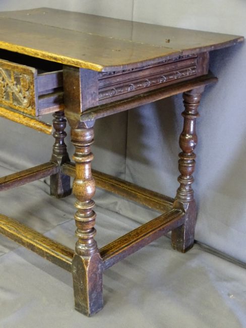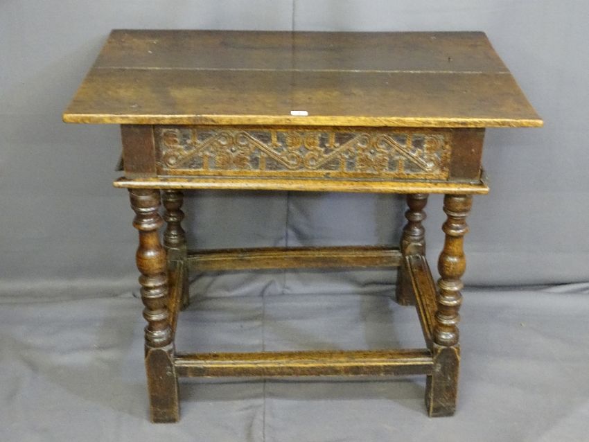 AN 18TH CENTURY OAK SIDE TABLE with an overhanging top to a narrow drawer with carved and scrolled front panel over an open base of finely turned and block supports with oblong stretchers, 79cms height, 95cms width, 61cms depth