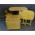 A WICKER WROUGHT IRON TABLE AND TWO CHAIRS, a woven storage basket and two light wood folding tables