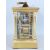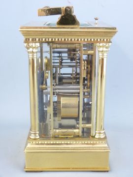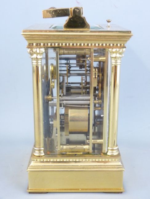 A FRENCH BRASS REPEATING CARRIAGE CLOCK, chase decorated front and white dial set with Roman numerals, lower alarm dial, the four glass case with visible platform and coiled gong with winding key, 19.5cms height handle up