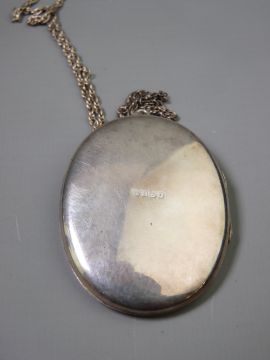 A LARGE OVAL PLAIN BACKED SILVER PHOTO LOCKET with bird and leaf decoration to the front and with white metal chain marked sterling, 30gms total
