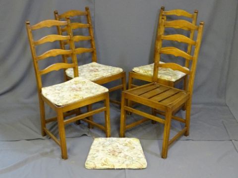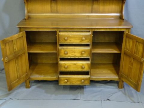 AN ERCOL MEDIUM COLOUR DINING SUITE consisting of dresser with four central drawers flanked by two cupboards and two shelf rack, a circular extending dining table and four ladder back chairs, 171cms height, 145cms width, 50cms depth for the dresser