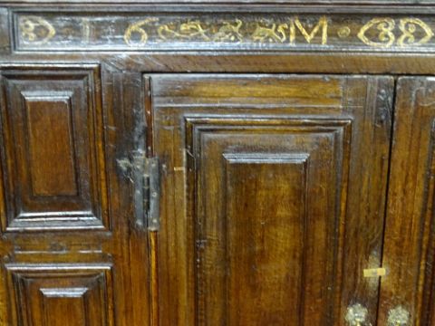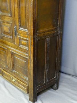 A LATE 17TH CENTURY BULK LIVERY CUPBOARD with a narrow date band to the top, 1699MM and two central fielded panel cupboards with three fielded panels either side to a base of three oblong panels and two very narrow drawers, the interior complete with original wooden hooks, top and bottom, 182cms height, 149cms width, 50cms depth