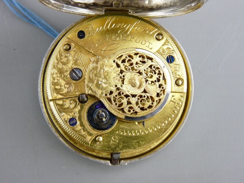 A GEORGE IV SILVER PAIR CASED FUSEE POCKET WATCH by Bullingford Liverpool, the white enamel dial set with Arabic numerals (some damage to dial) with winding key, outer case and watch hallmarked 'Birmingham 1823'