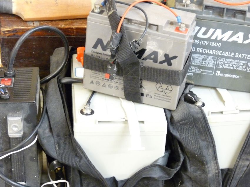 A GOOD FOUR WHEEL GOLF BUGGY with batteries and a 'Hillbilly' electric trolley with battery