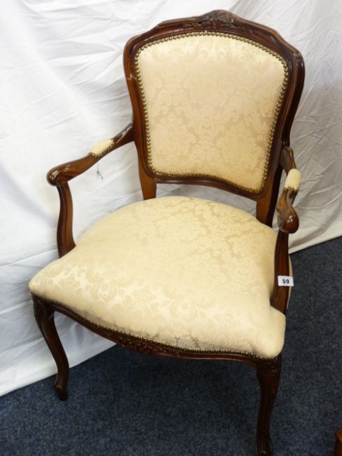 A FRENCH REGENCY STYLE MAHOGANY ELBOW CHAIR with cream floral seat and back and padded arms