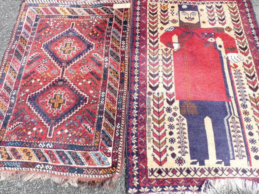 TWO SMALL EASTERN TYPE WOOLEN RUGS, one patterned as a soldier in uniform on a cream ground with double border, the other classically styled with diamond central block pattern and triple border, 146 x 93 and 130 x 88cms respectively