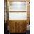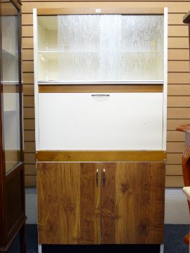 A CREAM AND WOOD EFFECT KITCHEN CABINET BY FORTRESS LTD, top shelves with sliding glass doors, a middle fall front section and two base cupboards