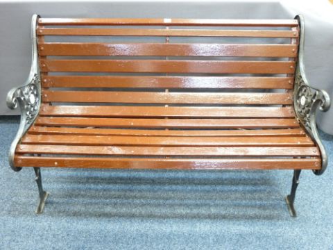 A VINTAGE CAST IRON AND SLATTED-SEAT GARDEN BENCH, 75.5cms height, 126cms width, 65cms depth