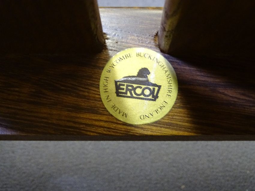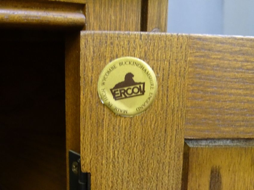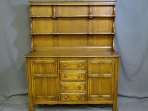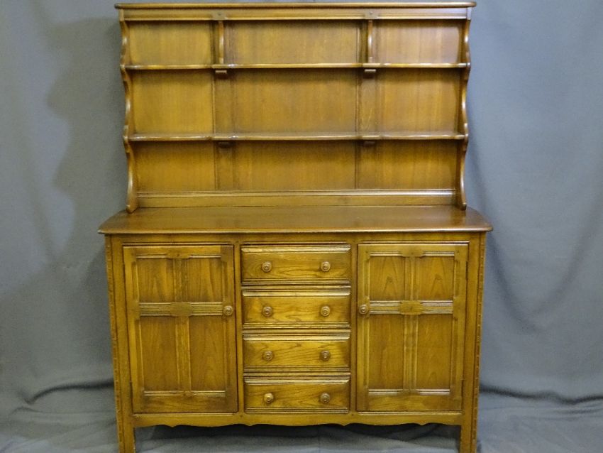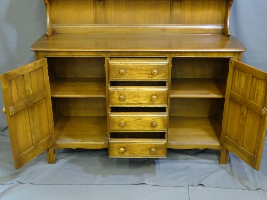 A MID TO LATE TWENTIETH CENTURY ERCOL DINING SUITE of dresser, circular dining table and four ladder back chairs, 171cms height, 145cms width, 50cms depth the dresser