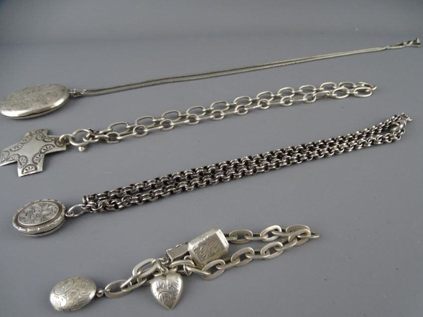 TWO SILVER LOCKETS & A CROSS on silver and white metal necklaces and a silver bracelet with miniature locket type pendants