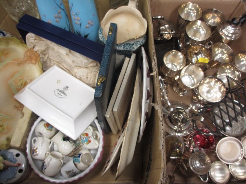 A BOX OF ASSORTED CHINA AND GLASSWARE including Goss, boxed Worcester plates, a pair of milk glass vases and a box of mixed electroplate ETC