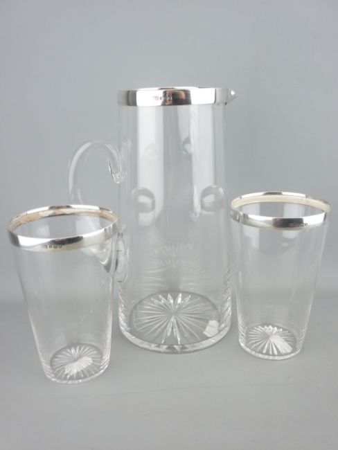 A VICTORIAN GLASS LEMONADE JUG AND TWO BEAKERS WITH SILVER COLLARS, Sheffield 1865, Atkin Brothers maker's mark, 23cms height the jug