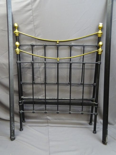 AN IRON SINGLE BED FRAME with brass finials and top rail