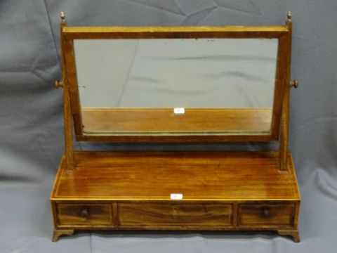 A REGENCY MAHOGANY SWING TOILET MIRROR on a three drawer base with box wood string inlay, 59.5cms height, 71cms width, 27cms depth