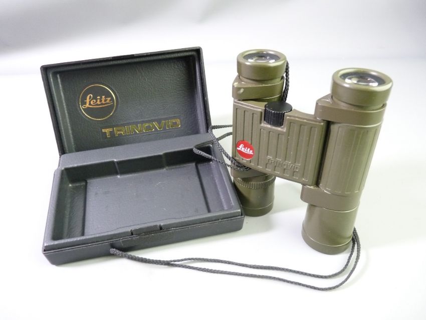 A PAIR OF GREEN LEITZ TRINOVID BINOCULARS in hard plastic case