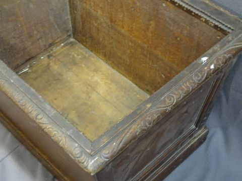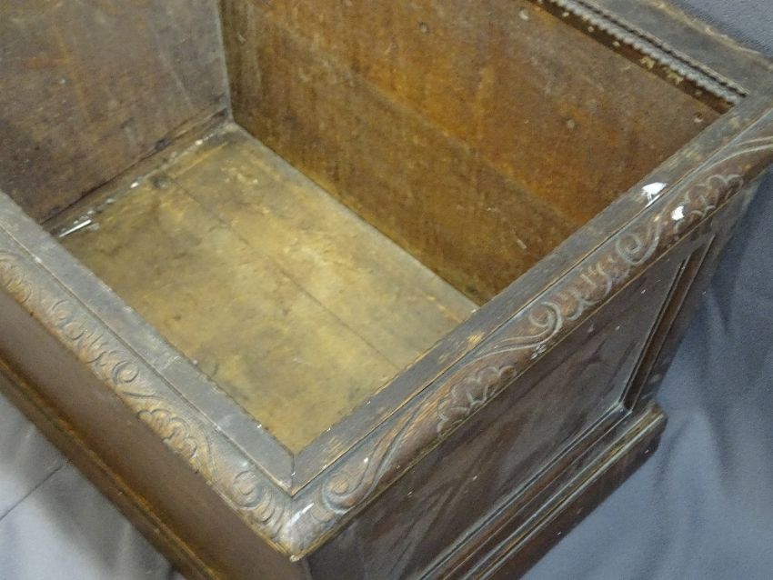 AN ANTIQUE OAK PLANTER - Sarcophagus shaped with carved rail detail and carved panel to the front