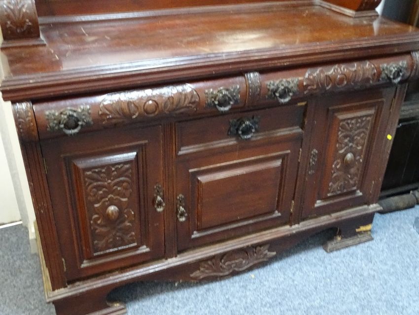 SUBSTANTIAL EDWARDIAN MIRROR BACK SIDEBOARD with reeded canopy support pillars, carved detail and fancy ring pull handles, 129cms high overall, 150cms wide, 54cms deep