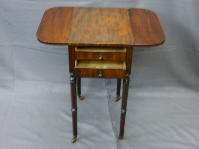 ANTIQUE PEMBROKE TABLE on turned supports with two single end drawers, a two tier planter and a folding table