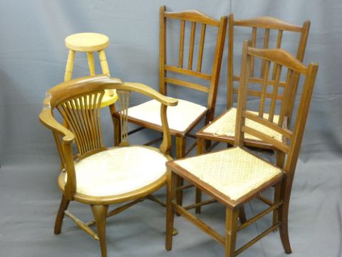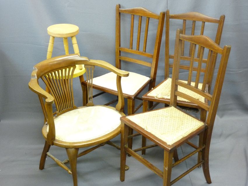 PARCEL OF THREE SIMILAR INLAID BEDROOM CHAIRS, a single tub chair and a kitchen stool ETC
