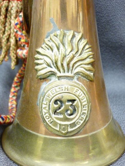 ASSORTED MILITARY RELATED COLLECTABLES, two copper and brass bugles, one marked 'Hawkes & Son, London', the other with Royal Welch Fusiliers emblem, two American Civil War type caps, two vintage Eastern style daggers, a reproduction flintlock pistol, canvas belt with name 'Ellis' and a leather belt with side pouch marked 'Jones' ETC