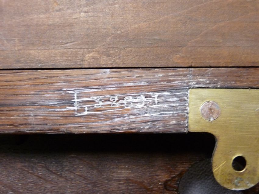 GILLOWS STAMPED OAK FRAMED MIRROR, 118 x 79cms, carved outer details and rib pattern surrounding a bevelled edge looking glass