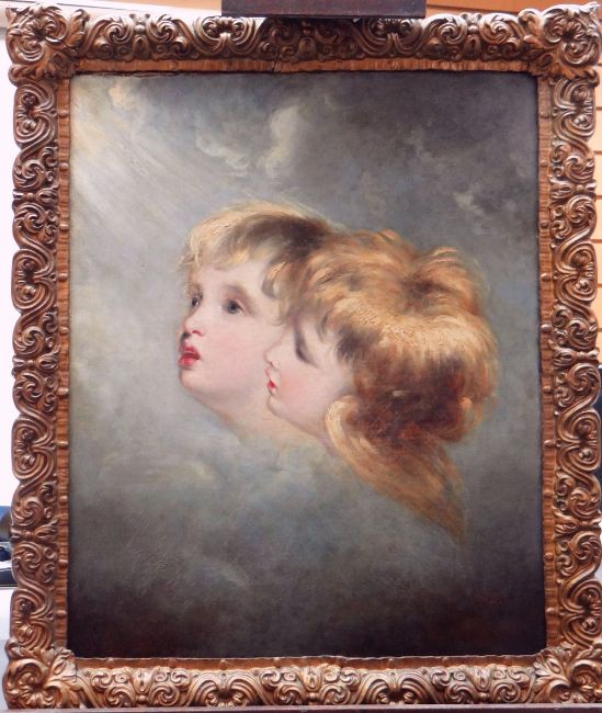 REUBEN SAYERS (1815-1888) oil on canvas - two cherubs' heads within sky background, gazing towards shaft of light, signed, 52 x 42cms