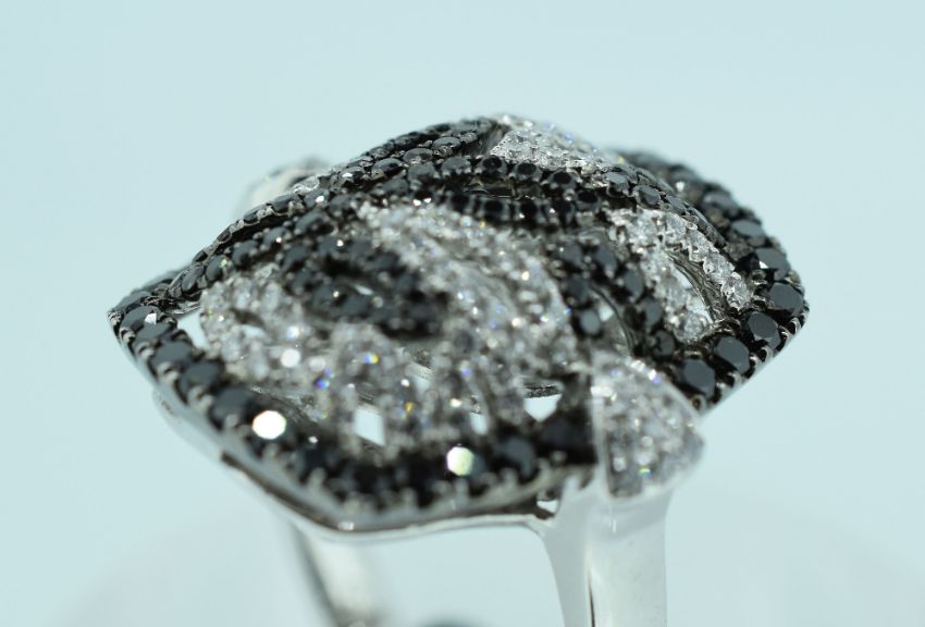18CT WHITE GOLD DIAMOND RING featuring 105 round brilliant cut black diamonds (1.15ct TDW) with eighty-six round brilliant cut white diamonds (0.61ct TDW)
