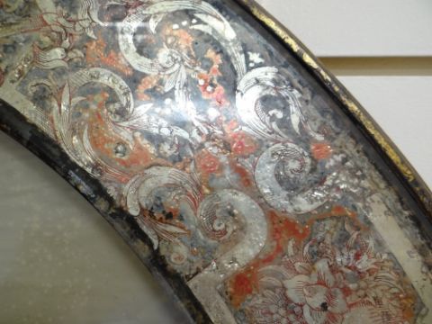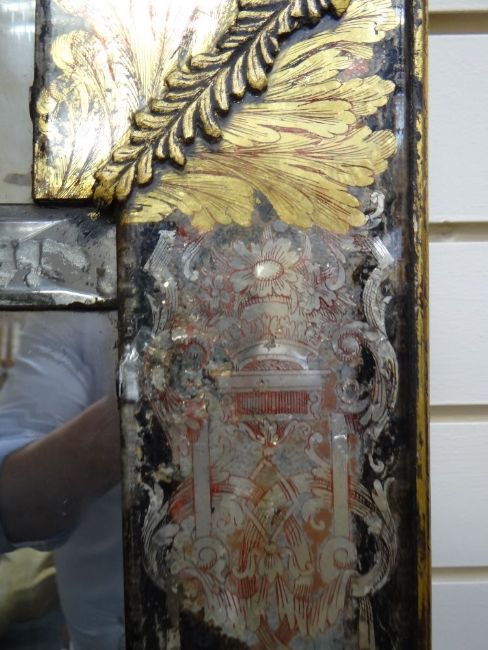 A WILLIAM & MARY PIER GLASS CIRCA 1700 rectangular bevelled plate beneath bevelled arched plate with dividing border of glass, verre églomisé panels in silver, black, gold and red depicting classical figures, foliate, pedestals, strapwork and masks, 183cms high x 97cms wide Provenance: Pembrokeshire estate, purchased for £16,500 as Lot 48 at Sotheby's 15th September 1992 from The Estate of the late Walton Mountain of Groombridge Place, Kent. Previously purchased from Edwards & Sons 157-161 Regent Street London, 1929Included is the lot is the original sales catalogue from Sotherby’s 1992
