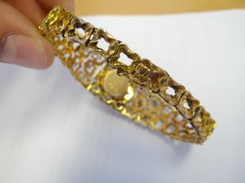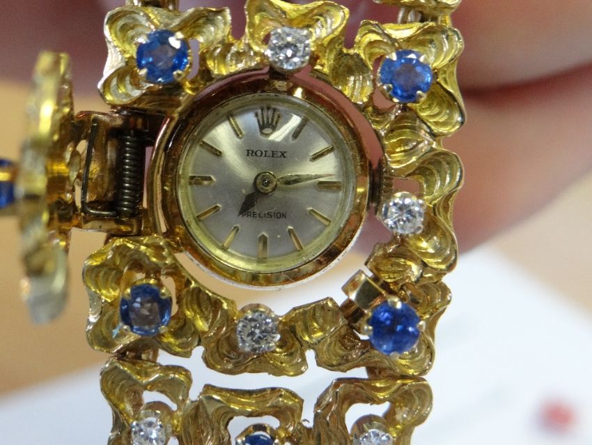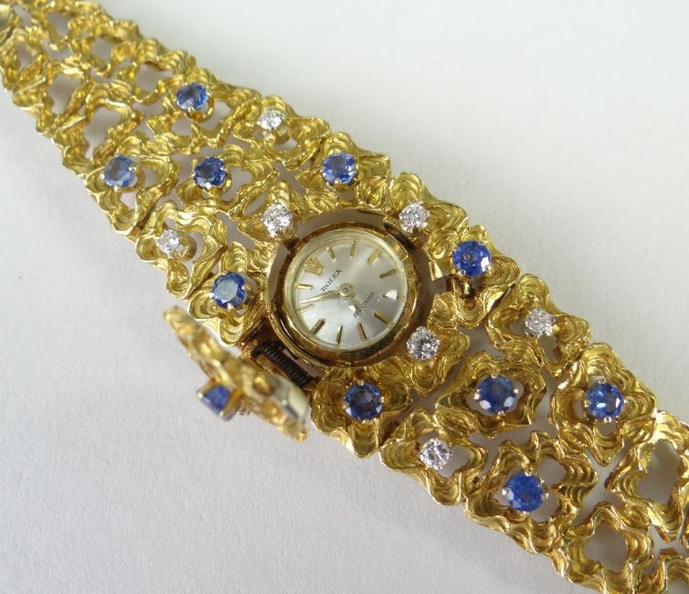 A LADIES ROLEX 'PRECISION' 18CT YELLOW GOLD BRACELET WATCH set with an arrangement of eleven sapphires and eight diamonds, the circular dial behind a hinging encasement within the bracelet, the encasement is released by a gentle movement of the protruding sapphire, the textured bracelet is of tapering openwork form, hallmarked 750, total weight 55gms, tan leather Rolex box