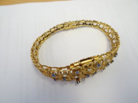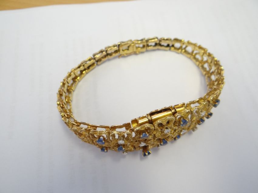 TOGETHER WITH a pair of two-section drop stud-earrings in 14ct yellow gold and set with thirteen sapphires and five diamonds each (commissioned to match the bracelet watch)