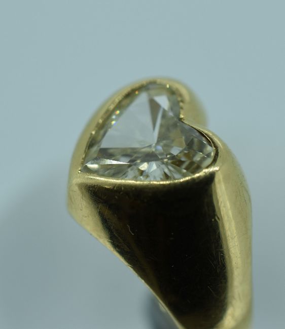 A SUPERB HEART SHAPED DIAMOND set in an 18ct yellow gold ring, visual estimate of diamond approx 2ct (9mms wide, 6.5mms vertical at centre of heart), ring size 'L', total weight 7.2gms