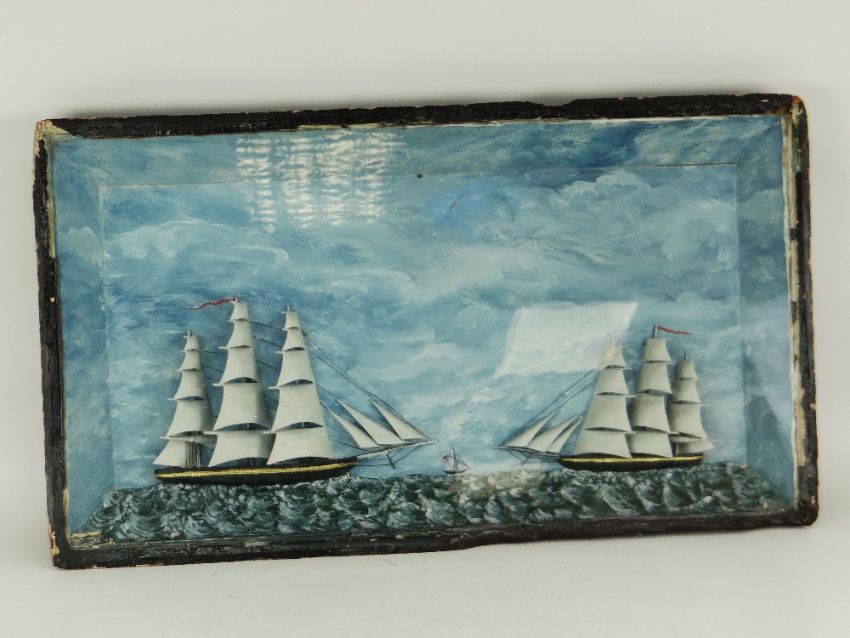 MARITIME DIORAMA featuring two tall sailing ships, on a raised painted squally sea and with painted sky and distant ship, all within a wooden frame (frame slightly distressed), 68 x 38cms