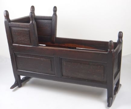 NINETEENTH CENTURY OAK CRIB with acorn finials