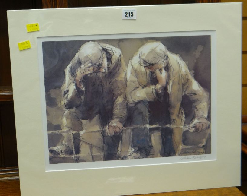 WILLIAM SELWYN coloured print - two farmers in conversation at the mart, signed, 30 x 39.5cms
